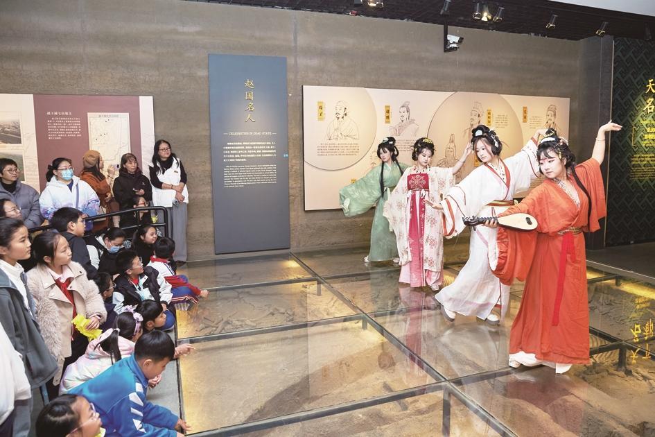 展廳內(nèi),身著古裝的工作人員,與正在參與“尋寶”活動(dòng)的觀眾不期而遇,相映成趣。人們精神飽滿,或低聲交流觀感,或駐足細(xì)品文物,完全沉浸在“邯博之夜”的獨(dú)特氛圍中。