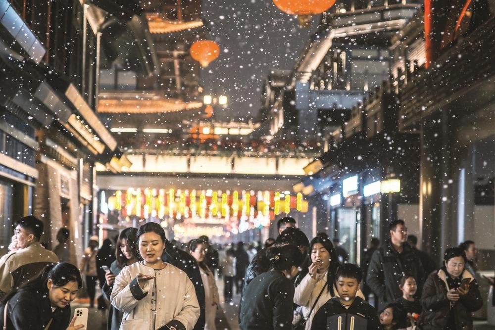 邯鄲道的冬日因人造雪景煥發(fā)別樣生機(jī),成為市民熱門打卡地。這里的造雪景觀融合歷史韻味與浪漫氛圍,雪花漫天飄灑,與街區(qū)古樸景致相映成趣,氛圍感拉滿,拍照格外出片。造雪景觀自11月起定時上演,每日19:30、20:30、21:00、21:30多時段飄雪,覆蓋南北兩區(qū)核心區(qū)域。無需門票即可沉浸式體驗,大人孩童嬉戲玩雪,身著特色服飾的游客定格美好瞬間,盡享銀裝素裹的樂趣,為邯鄲的冬日文旅增添了鮮活亮點(diǎn)。(記者 范文平 攝)