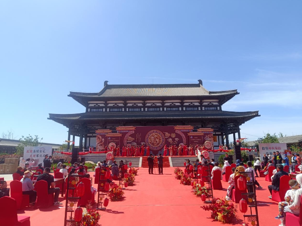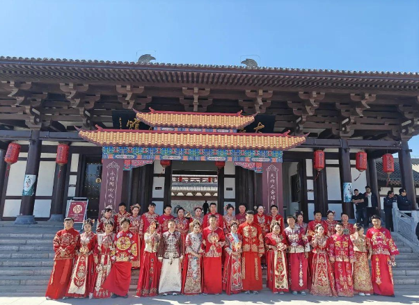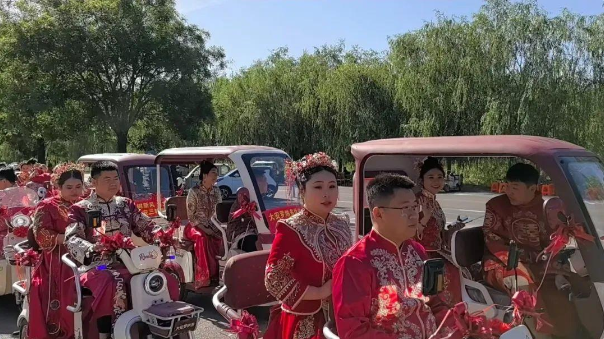 當(dāng)天,新郎新娘在愜山湖公園集合,在倡導(dǎo)移風(fēng)易俗的背景板前打卡拍照,隨后乘坐三輪車,沿著既定路線,開啟幸福巡游。16對(duì)新人以漢家儀禮為媒,身著傳統(tǒng)服飾,莊重又浪漫。他們?cè)诒娙说囊娮C下許下相伴一生的承諾,既傳承了中華傳統(tǒng)文化,又踐行了移風(fēng)易俗的新風(fēng)尚?,F(xiàn)場(chǎng)的氛圍溫馨又感人,每對(duì)新人的臉上都洋溢著幸福的笑容。