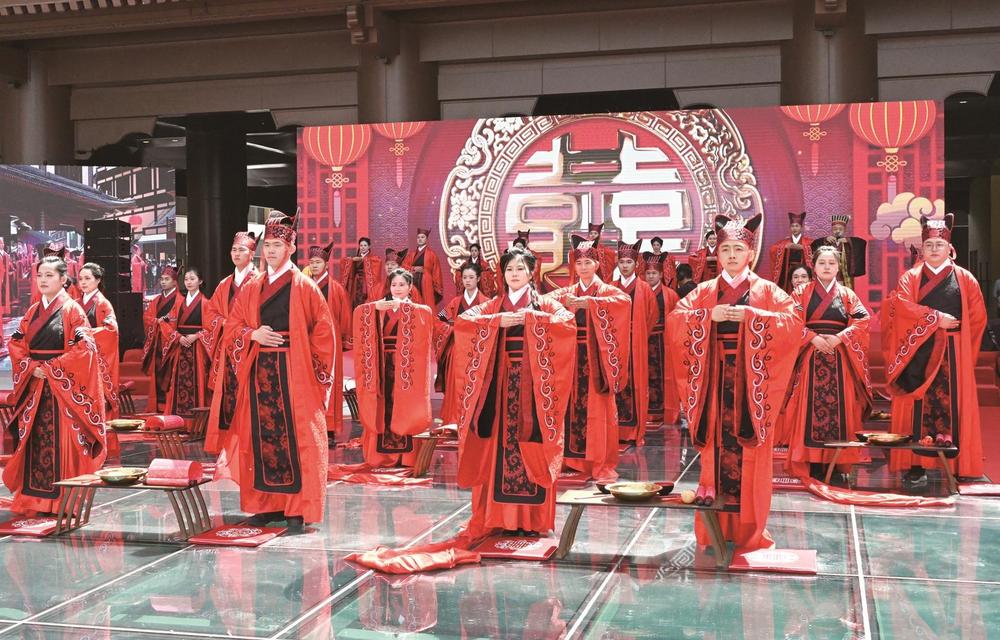婚禮主會場以中國紅為主色調(diào),趙王閣的飛檐斗拱與紅毯喜帳相映成趣,營造出古典浪漫的氛圍。新人們身著典雅的中式禮服,依循傳統(tǒng)禮制,先后行沃盥禮、合巹禮、對拜禮、執(zhí)手禮,舉行交換婚書儀式。在眾人的見證下,他們許下莊重誓言,攜手邁向人生新旅程。