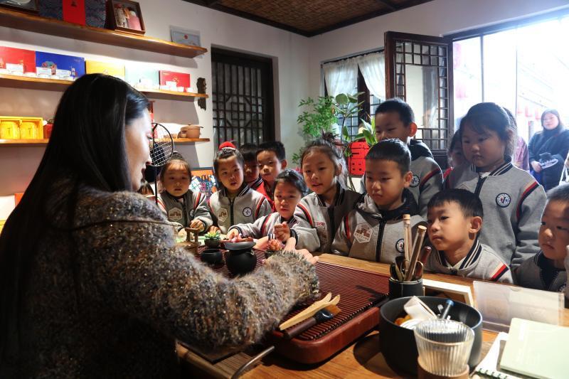李景濂故居內(nèi)茶香裊裊。孩子們圍坐桌前,在工作人員的示范下,認(rèn)識(shí)茶盤、茶壺、茶杯等茶具,學(xué)習(xí)茶藝的基本流程。在潛移默化中體會(huì)“茶禮”所蘊(yùn)含的謙遜、恭敬、專注之道。