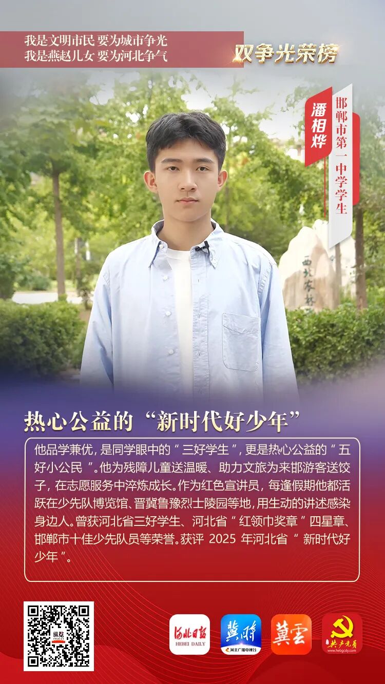 他品學(xué)兼優(yōu),是同學(xué)眼中的“三好學(xué)生”,更是熱心公益的“五好小公民”。他為殘障兒童送溫暖、助力文旅為來邯游客送餃子,在志愿服務(wù)中淬煉成長。作為紅色宣講員,每逢假期他都活躍在少先隊博覽館、晉冀魯豫烈士陵園等地,用生動的講述感染身邊人。曾獲河北省三好學(xué)生、河北省“紅領(lǐng)巾獎?wù)隆彼男钦?、邯鄲市十佳少先隊員等榮譽。獲評2025年河北省“新時代好少年”。