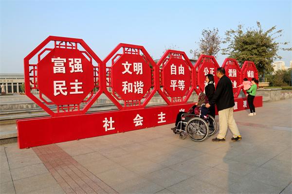 館陶縣在公園、廣場(chǎng)設(shè)置社會(huì)主義核心價(jià)值觀景觀小品,游客駐足觀看。郝立翠攝